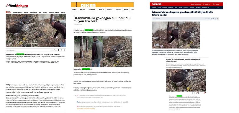 14.10.2025 tarihinde, İstanbul DKMP Müdürlüğümüze ulaşan ihbara istinaden, İstanbul İline bağlı, Silivri ilçesinde bulunan adreste, İstanbul Emniyet Müdürlüğü ekipleri ile ortaklaşa gerçekleştirilen ev aramasında, yasa dışı yollarla yakaladıkları canlıları, yurt dışına çıkarma hazırlığında olduğu tespit edilen ve ev araması sırasında, arka bahçeye atarak saklamaya çalıştıkları 2 (İki) Adet Gökdoğan (Falco pregrinus) türü canlıya el konulmuş, yabancı uyruklu, ilimizde oturumu olan 2 (İki) kişiye idari işlem uygulanmak üzere tutanak tanzim edilmiştir. Söz konusu canlıları yurtdışına çıkarmak isteyen 2 şahsa, 1.524.798 TL idari para cezası ve tazminat bedeli uygulanacaktır. Söz konusu 2 adet Gökdoğan, tedavilerinin ardından doğaya salınmak üzere Polonezköy Sülün Üretme İstasyonunda muhafaza edilmektedir.