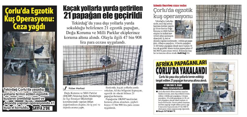 20.10.2025 tarihinde, Tekirdağ DKMP Müdürlüğümüze ulaşan ihbara istinaden, Tekirdağ iline bağlı, Çorlu ilçesinde bulunan adreste, Tekirdağ Emniyet Müdürlüğü ekipleri ile ortaklaşa gerçekleştirilen iş yeri ve depo aramasında, yasa dışı yollarla temin edilen hayvanların üretildiği tespit edilmiştir. 1 Adet Afrika Gri Papağanı, 4 Adet Forpus Papağanı, 10 Adet Sevda Papağanı ve 26 Adet Sultan Papağanı türü canlıya el konulmuş ve bir kişiye idari işlem uygulanmak üzere tutanak tanzim edilmiştir. 4915 Kara Avcılığı Kanunu’nun 18/1 maddesi gereğince ilgiliye 47.908,00 TL idari para cezası uygulanmasına karar verilmiştir. Söz konusu 1 Adet Afrika Gri Papağanı, 4 Adet Forpus Papağanı, 10 Adet Sevda Papağanı ve 26 Adet Sultan Papağanı bakımları yapılmak üzere Çatalca Antikköy Hayvanat Bahçesine 21.10.2025 tarihinde yedi emin olarak teslim edilmiştir.